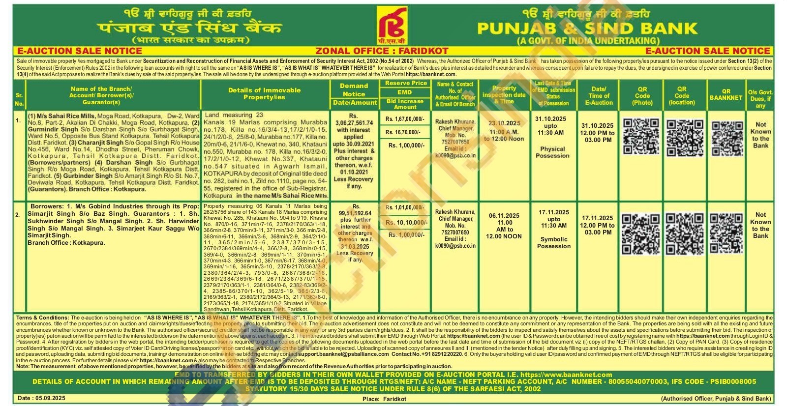 Land measuring 23 , Kanals 19 Marlas comprising Murabba no.178, Killa no.16/3/4-13,17/2/1/0-15. 24/1/2/0-6, 25/8-0, Murabba no. 177, Killa no. 20m/0-6, 21/1/6-0, Khewat no. 340, Khatauni , no.550, Murabba no. 178, Killa no. 16/3/2-0, . 17/2/1/0-12. Khewat No.337, Khatauni . no.547 situated in Agwarh Ismail, KOTKAPURA by deposit of Original title deed , no. 282, bahi no. 1, Zild no. 1110, page no. 54-55, registered in the office of Sub-Registrar, Kotkapura in the name M/s Sahai Rice Mills