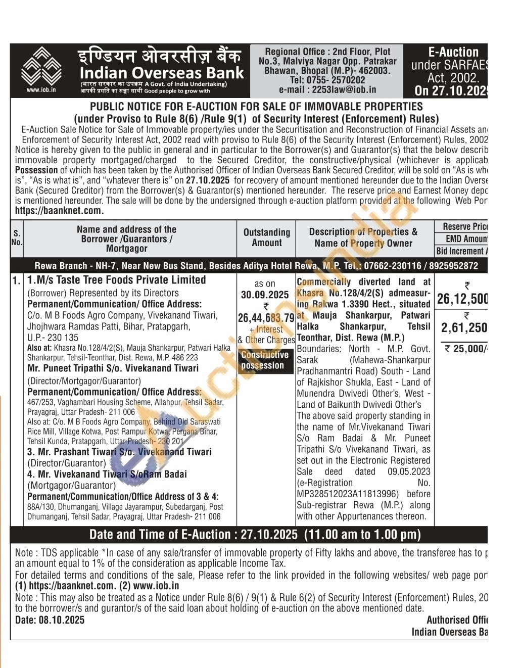 Commercially diverted land at ing Rakwa 1.3390 Hect., situated Khasra No.128/4/2(S) admeasur-at Mauja Shankarpur, Patwari Halka Shankarpur, Tehsil Teonthar, Dist. Rewa (M.Ρ.) Boundaries: North M.P. Govt. Sarak (Mahewa-Shankarpur Pradhanmantri Road) South Land of Rajkishor Shukla, East Land of Munendra Dwivedi Other's. West Land of Baikunth Dwivedi Other's The above said property standing in the name of Mr.Vivekanand Tiwari S/o Ram Badai & Mr. Puneet Tripathi S/o Vivekanand Tiwari, as set out in the Electronic Registered Sale deed dated 09.05.2023 (e-Registration No. MP328512023A11813996) before Sub-registrar Rewa (M.P.) along with other Appurtenances thereon