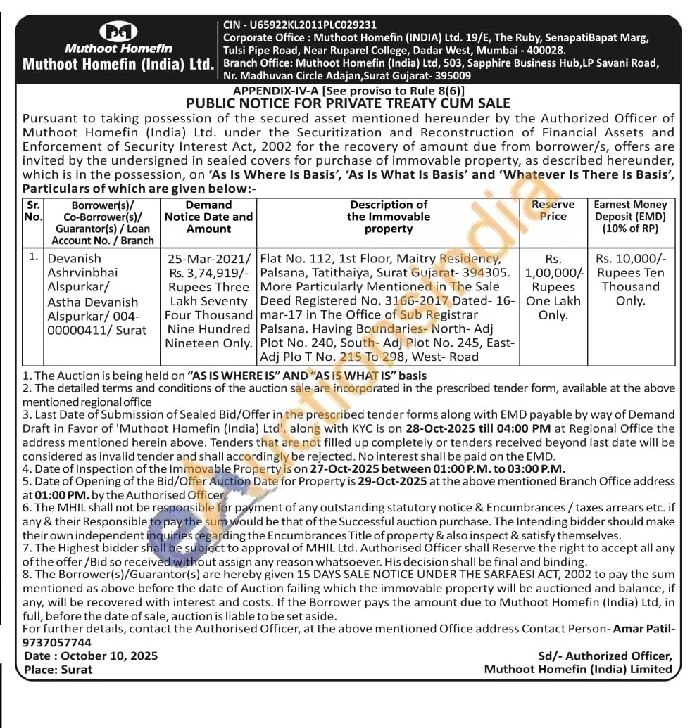 Flat No. 112, 1st Floor, Maitry Residency, Palsana, Tatithaiya, Surat Gujarat-394305. More Particularly Mentioned in The Sale Deed Registered No. 3166-2017 Dated-16-mar-17 in The Office of Sub Registrar Palsana. Having Boundaries- North- Adj Plot No. 240, South- Adj Plot No. 245, East-Adj Plo T No. 215 To 298, West- Road