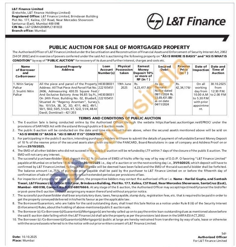 Address: All That Piece And Parcel Flat No. 2406, Admeasuring 430.55 Square Feet/And Exclusive Balcony Area 96.85 Sq.Ft., On 24th Floor, Building No. 02, Bluebell, Situated At "Regency Anantam", Survey L No. 101/3A, 3B, 3C, 3D, 47/1, 44/2, 49/1, 50/1, 50/2, 50/5, 51/2A, 97, 52/2, 51/4, 48 At Davdi, Dombivali-421203