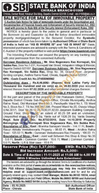 All the part and parcel of the property of Old Prakasam District, Present Bapatla District Chirala Sub-Register Office, Chirala Municipality, Andhra Ratna Read, Old Municipal Ward No.3, Panchyathi Ward No. 1, TS Ward No.3, Block No.7, TS No. 396,397,398, Present Ward No.20, Chirala Village S.No.301/1, Door No 20-12-78,79,80,81,82,83 Janjanam Building Complex, Ground Floor, Shop No.38, an extent of 85.25 Stt and an undivided, Unspecified share of site 3 Sq. Yards out of 1526 28 Sq. Yards Bearing Regd. Sale deed Doc. No.5732/2010, Date 14.10.2010 Property Belongings to Mr. Kornepati Siva Nageswara Rao, S/o Subba Rao. Boundaries of Site: East: Bramha Samajam Veedhi-144.11 Fl, South: Ravuri Akkala Venkateswarlu Property 96.02 FI, West: Andhra Ratna Road 125.02 Ft, North: Gummadi Venkateswara Rao Property 106.03 Ft. Boundaries of Shop: East: Joint wall Between this Shop & Shop No.35 5.6 Ft, South Common Corridor 15.6 Ft. West: Common Comidor-5.6 Ft, North: Lift & Stair case-15.6 Ft.