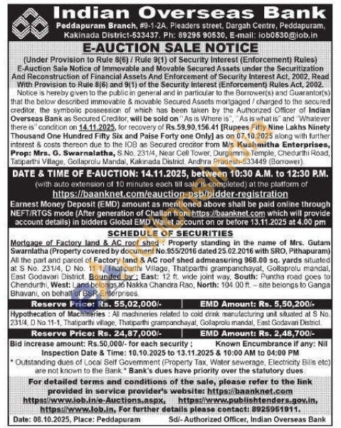 Hypothecation of Machineries All machineries related to cold drink manufacturing unit situated at S No. 231/4, D No. 11-1, Thatiparthi village, Thatiparthi grampanchayat, Gollaprolu mandal, East Godavari District