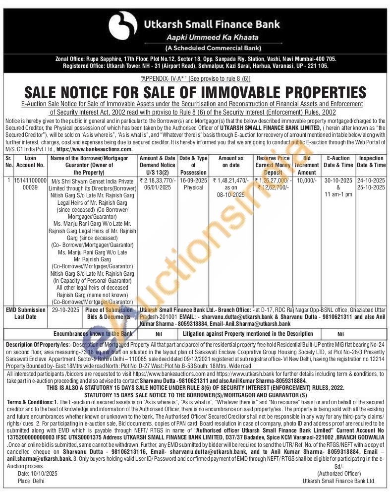 Description Of Property/ies:- Description of Mortgaged Property All that part and parcel of the residential property free hold Residential Built-UP entire MIG flat bearing No-24 on second floor, area measuring-73.18 sq mtr built on situated in the layout plan of Saraswati Enclave Cooprative Group Housing Society LTD, at Plot No-26/3 Presently Saraswati Enclave Appartment, Sector-9 Rohini Delhi-110085, sale deed dated 09/12/2021 registered at subregistrar office- VI New Delhi, having the registration no.12214 Property Bounded by- East: 18Mtrs wide road North: Plot No. D-27 West: Plot No.B-53 South: 18Mtrs. Wide road
