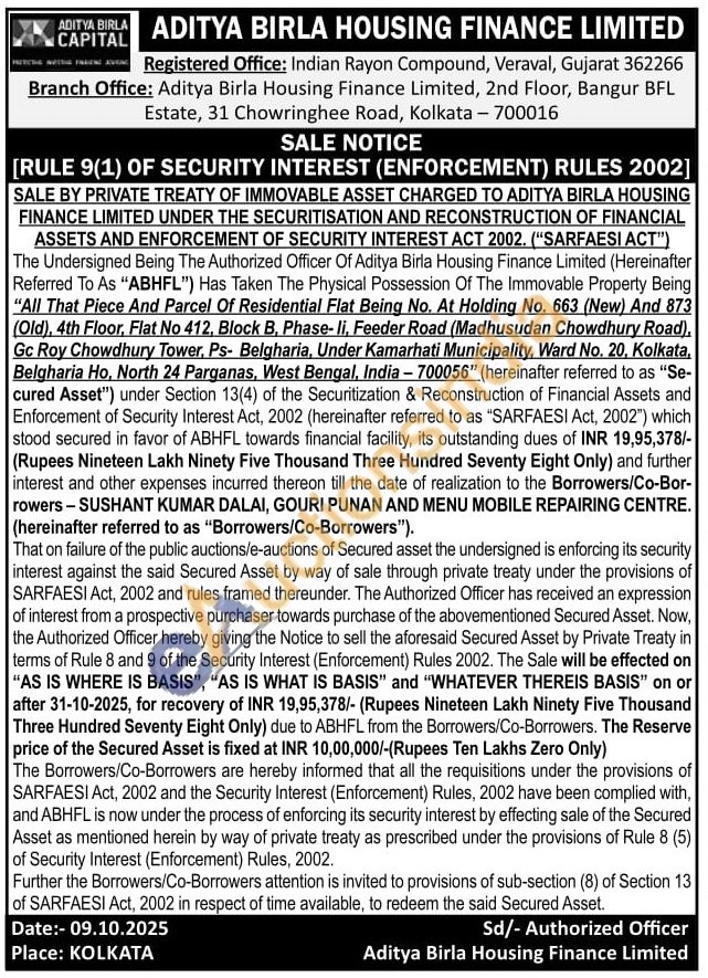 All That Piece And Parcel Of Residential Flat Being No. At Holding No. 663 (New) And 873 (Old), 4th Floor, Flat No 412, Block B, Phase-li, Feeder Road (Madhusudan Chowdhury Road), Gc Roy Chowdhury Tower, Ps- Belgharia, Under Kamarhati Municipality, Ward No. 20, Kolkata, Belgharia Ho, North 24 Parganas, West Bengal, India-700056