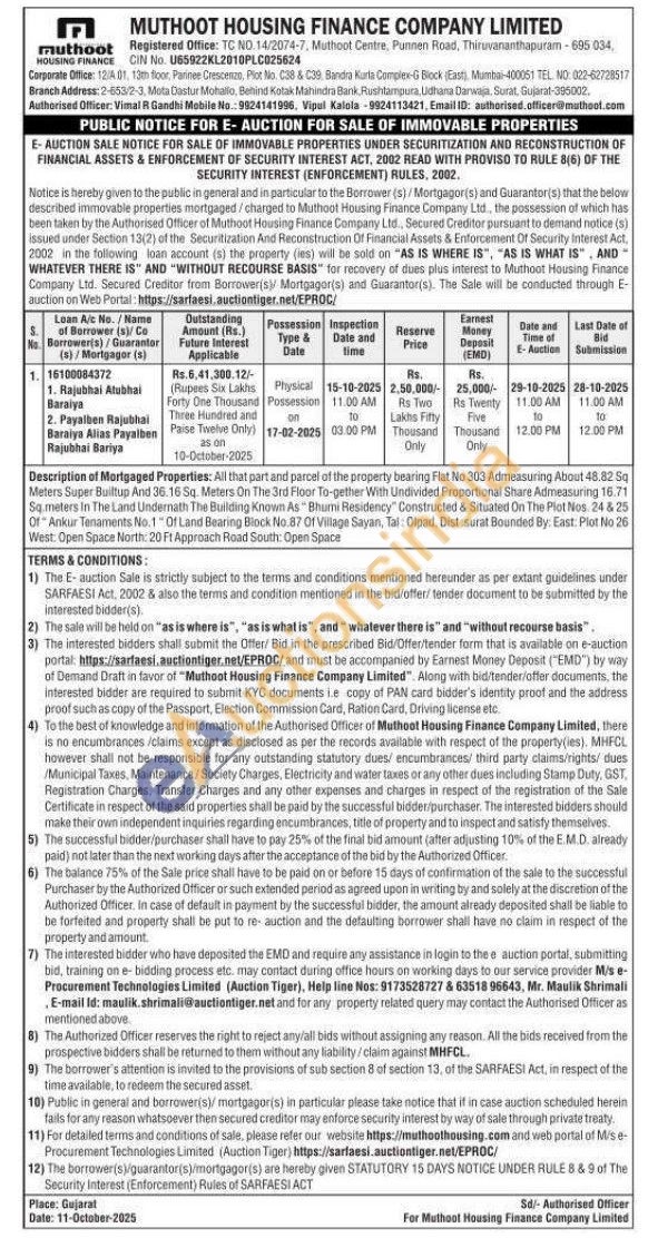 All that part and parcel of the property bearing Flat No 303 Admeasuring About 48.82.5q Meters Super Builtup And 36.16 Sq. Meters On The 3rd Floor To-gether With Undivided Proportional Share Admeasuring 16.71 Sq.meters In The Land Undernath The Building Known As Bhumi Residency" Constructed & Situated On The Plot Nos. 24 & 25 Of Ankur Tenaments No.1" Of Land Bearing Block No.87 Of Village Sayan, Tal: Olpad, Dist surat Bounded By: East: Plot No 26 West: Open Space North: 20 Ft Approach Road South: Open Space
