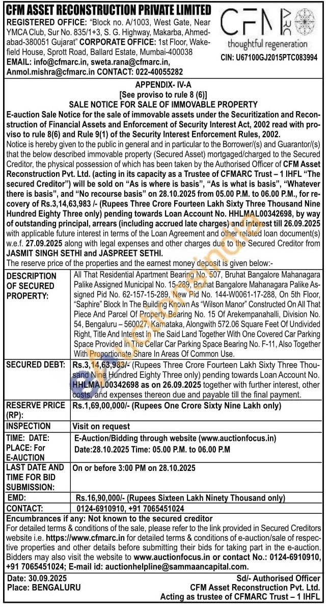 All That Residential Apartment Bearing No. 507, Bruhat Bangalore Mahanagara Palike Assigned Municipal No. 15-289, Bruhat Bangalore Mahanagara Palike As-signed Pid No. 62-157-15-289, New Pid No. 144-W0061-17-288, On 5th Floor, "Saphire" Block In The Building Known As "Wilson Manor" Constructed On All That Piece And Parcel Of Property Bearing No. 15 Of Arekempanahalli, Division No. 54, Bengaluru-560027, Karnataka, Alongwith 572.06 Square Feet Of Undivided Right, Title And Interest In The Said Land Together With One Covered Car Parking Space Provided In The Cellar Car Parking Space Bearing No. F-11, Also Together With Proportionate Share In Areas Of Common Use.