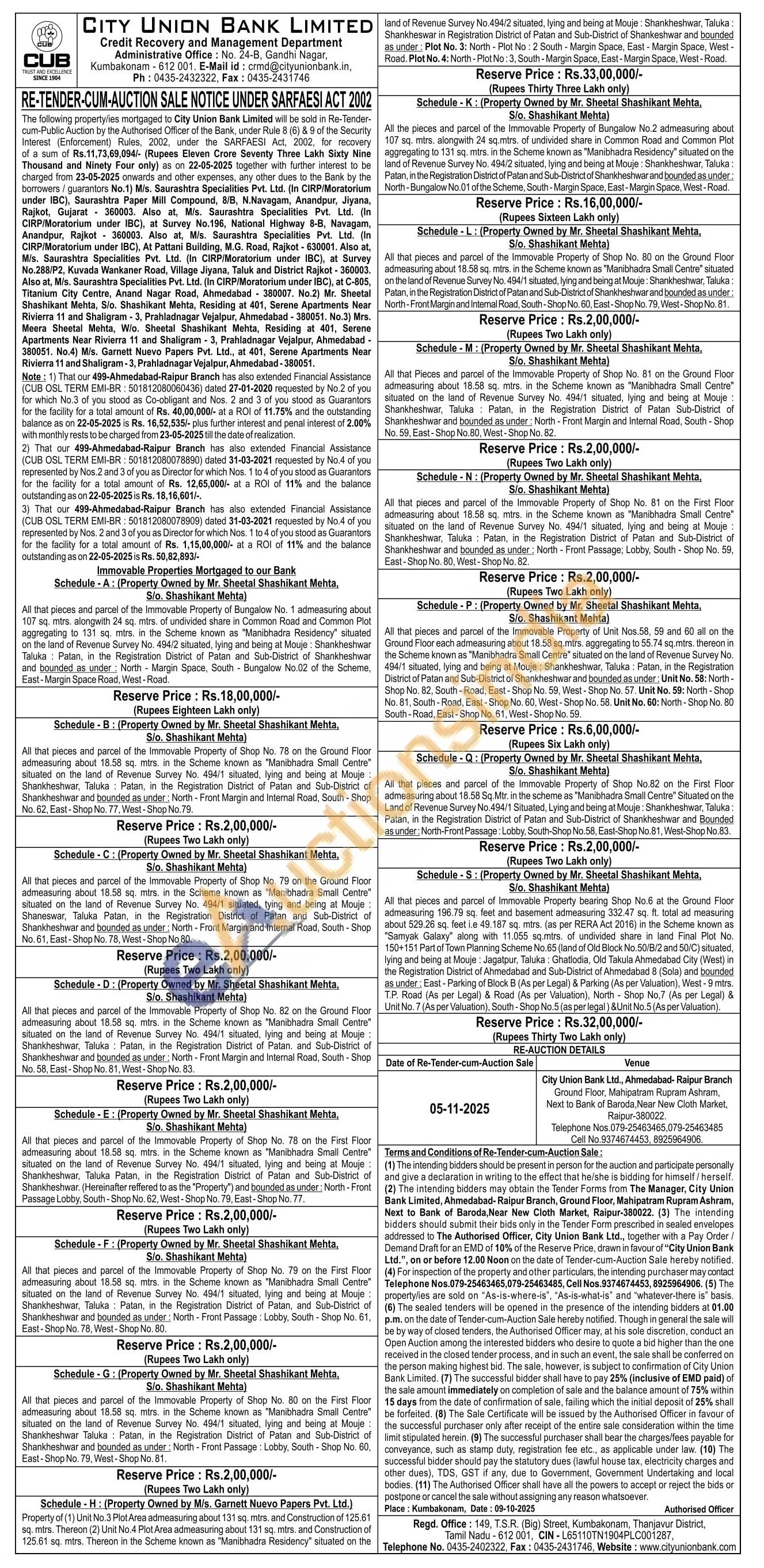 Schedule - N: (Property Owned by Mr. Sheetal Shashikant Mehta, S/o. Shashikant Mehta) All that pieces and parcel of the Immovable Property of Shop No. 81 on the First Floor admeasuring about 18.58 sq. mtrs. in the Scheme known as "Manibhadra Small Centre" situated on the land of Revenue Survey No. 494/1 situated, lying and being at Mouje: Shankheshwar, Taluka Patan, in the Registration District of Patan and Sub-District of Shankheshwar and bounded as under: North - Front Passage; Lobby, South Shop No. 59, East-Shop No. 80, West-Shop No. 82.