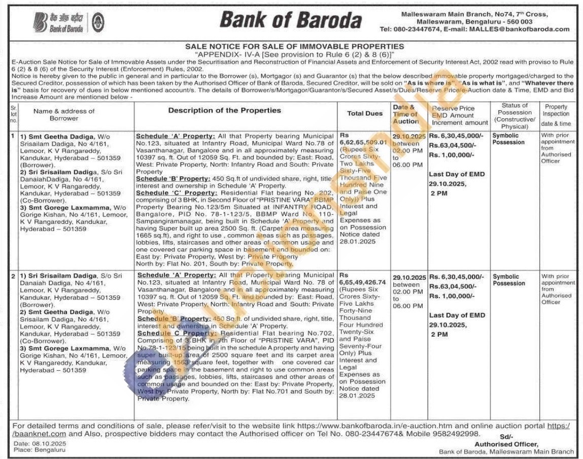 Schedule 'A' Property: All that Property bearing Municipal Re No. 123, situated at Infantry Road, Municipal Ward No. 78 of Vasanthanagar, Bangalore and in all approximately measuring 10397 sq. ft. Out of 12059 Sq. Ft. and bounded by: East: Road, West: Private Property, North: Infantry Road and South: Private Property Schedule 'B' Property: 450 Sq.ft. of undivided share, right, title, interest and ownership in Schedule 'A' Property. Schedule C Property: Residential Flat bearing No.702. Comprising of 3 BHK in 7th Floor of "PRISTINE VARA", PID No. 78-1-123/15 being built in the schedule A property and having super built-up area of 2500 square feet and its carpet area measuring 1563 square feet, together with one covered car parking space in the basement and right to use common areas such as passages, lobbies, lifts, staircases and other areas of common usage and bounded on the: East by: Private Property, West by: Private Property, North by: Flat No.701 and South by: Private Property.