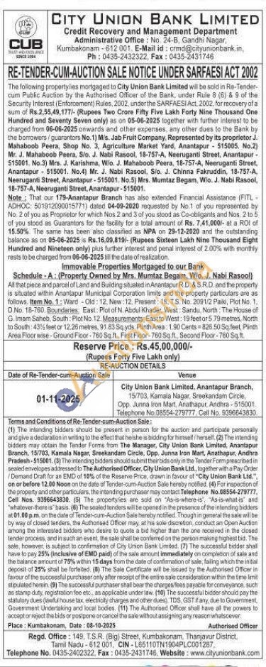 All that piece and parcel of Land and Building situated in Anantapur R.D. & S.R.D. and the property is situated within Anantapur Municipal Corporation limits and the property particulars are as follows. Item No. 1: Ward-Old: 12. New: 12. Present: 18, TS. No. 2091/2 Paiki, Plot No. 1. D.No. 18-760. Boundaries: East: Plot of N. Abdul Khader, West: Sandu, North: The House of G. Imam Saheb, South Plot No 12. Measurements: East to West: 19 feet or 5.79 metres, North to South: 43% feet or 12.26 metres, 91.83 Sq yds. Plinth Area: 1.90 Cents 826.50 Sq. feet, Pinth Area Floor wise Ground Floor-760 Sq.ft. First Floor-76050 ft. Second Floor-780 Sq.ft.