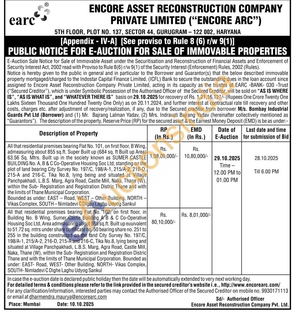 All that residential premises bearing Flat No. 102, on first floor, in Building No. B Wing, Sumer Castle Building A B & C Co-Operative Housing Soc Ltd, Area admeasuring about 555 sq.ft. Built up euuivalent to 51.72 sq. mtrs under share certificate no. 50 bearing share no. 251 to 255 in the building constructed on the land City Survey No. 197/C, 198/A-1, 215/A-2, 216-D, 215-A and 216-C, Tika No.8, lying being and situated at Village Panchpakhadi, L.B.S. Marg, Agra Road, Castle Mill, Naka, Thane (W), within the Sub-Registration and Registration Distric Thane and with the limits of Thane Municipal Corporation. Bounded as under: EAST- Road, WEST- Other Building, NORTH- Vikas Complex, SOUTH-Nimladevi C Dighe Laghu Udyog Sankul
