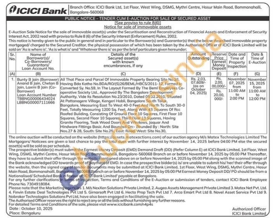 All That Piece and Parcel Of Immovable Property Bearing Site No.26. Having Bda Katha No.BDA/RO/(S)26/BEML/HBCS/2011-12, Formed In Converted Sy. No.59, In The Layout Formed By The Beml Employees Co-operative Society Ltd., Approved By The Bangalore Development Authority, Vide Its Resolution No.23/2010, Dated 05.02.2010, Situated At Pattanagere Village, Kengeri Hobli, Bangalore South Taluk, Bangalore, Measuring East To West 40-0 Feet And North To South 30-0 Feet, Totally Measuring 1200 Sq. Feet, Along With 43 Squares Of Rec Roofed Building, Consisting Of Ground Floor 10 Squares, First Floor 10 Squares, Second Floor 10 Squares, Third Floor 13 Squares, Having Granite Flooring, Teak Wood Doors And Windows, Jaquar And Hindware Fittings Basic And Bounded On:- Bounded By: North: Site Nos.27 & 28, South: Site No.25., East: Road, West: Site No.30