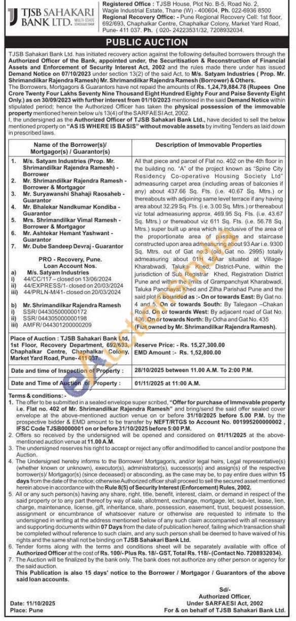 All that piece and parcel of Flat no. 402 on the 4th floor in the building no. "A" of the project known as "Spine City Residency Co-operative Housing Society Ltd admeasuring carpet area (including areas of balconies if any) about 437.66 Sq. Fts. (le. 40.67 Sq. Mirs.) or thereabouts with adjoining same level terrace if any having area about 32.29 Sq. Fts. (1.0.3.00 Sq. Mtrs.) or thereabout viz total admeasuring approx. 469.95 Sq. Fts. (e. 43.67 Sq. Mtrs.) or thereabout viz 611 Sq. Fts. (ie. 56.78 Sq. Mirs) super built up area which is inclusive of the area of the proportionate area of passage and staircase constructed upon area admeasuring about 93 Aari.e. 9300 Sq. Mirs, out of Gat no.3 (old Gat no. 2995) totally admeasuring about 01H 48Aar situated at Village-Kharabwadi, Taluka Khed, District-Pune, within the jurisdiction of Sub Registrar Khed, Registration District Pune and within the limits of Grampanchyat Kharabwadi, Taluka Panchayat Khed and Zilha Parishad Pune and the said plot is bounded as: On or towards East: By Gat no. 4 and 5. On or towards South: By Talegaon-Chakan Road, On or towards West: By adjacent road of Gat No. 436. On or towards North: By Odha and Gat No. 435