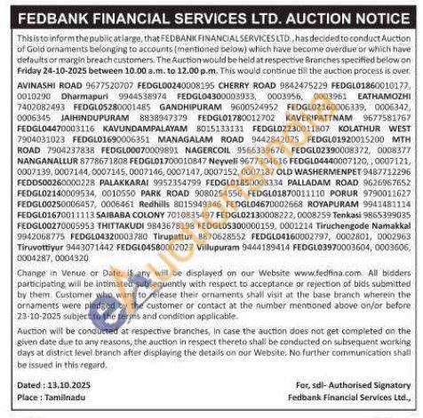 Fedbank Financial Services Ltd Gold Auctions Auction in Villupuram