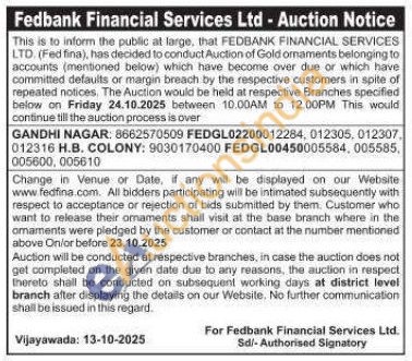 Fedbank Financial Services Ltd Gold Auctions Auction in Vijayawada