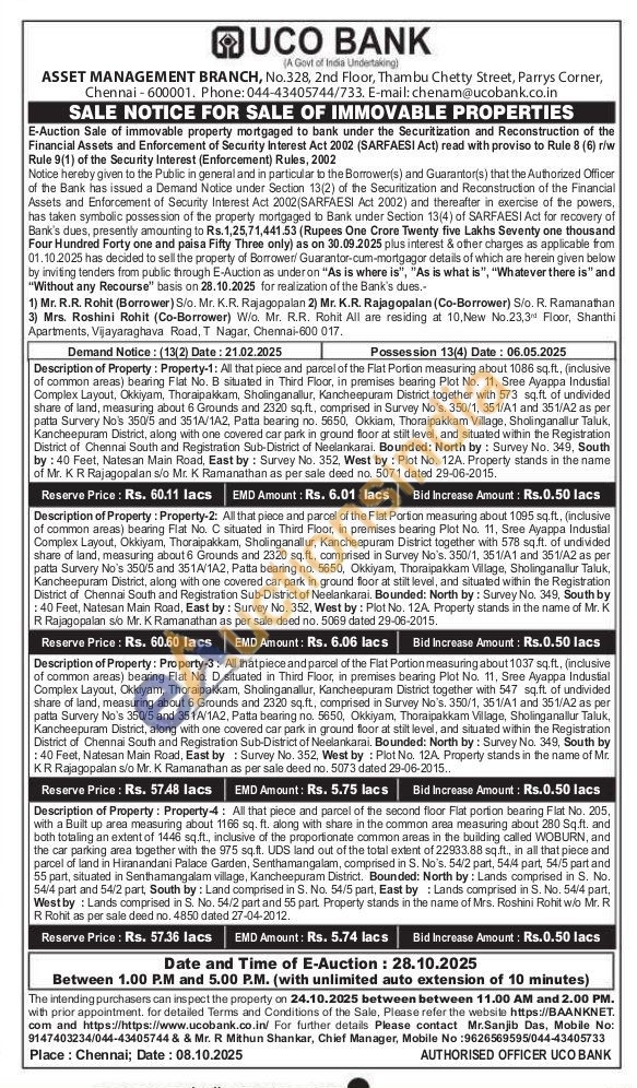 Property-4: All that piece and parcel of the second floor Flat portion bearing Flat No. 205, with a Built up area measuring about 1166 sq. ft. along with share in the common area measuring about 280 Sq.ft. and both totaling an extent of 1446 sq.ft., inclusive of the proportionate common areas in the building called WOBURN, and the car parking area together with the 975 sq.ft. UDS land out of the total extent of 22933.88 sq.ft., in all that piece and parcel of land in Hiranandani Palace Garden, Senthamangalam, comprised in S. No's. 54/2 part, 54/4 part, 54/5 part and 55 part, situated in Senthamangalam village, Kancheepuram District. Bounded: North by: Lands comprised in S. No. 54/4 part and 54/2 part, South by: Land comprised in S. No. 54/5 part, East by: Lands comprised in S. No. 54/4 part, Westby: Lands comprised in S. No. 54/2 part and 55 part. Property stands in the name of Mrs. Roshini Rohit w/o Mr. R R Rohit as per sale deed no. 4850 dated 27-04-2012.