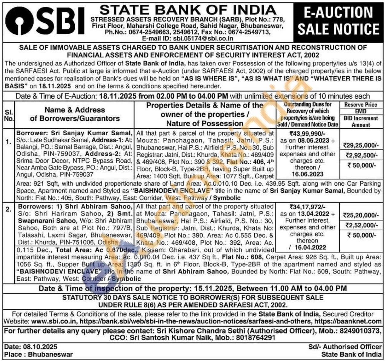 All that part and parcel of the property situated at Mouza: Panchagaon, Tahasil: Jatni, P.S.: Bhubaneswar, Hal P.S.: Airfield, P.S. No.: 30, Sub Registrar: Jatni, Dist.: Khurda, Khata No: 469/409, Plot No.: 390. Area: Ac 0.555 Dec. & Khata No.: 469/408, Plot No.: 392, Area: Ас. 0.115 Dec., Total Area: Ac 0.670dec., Kissam: Gharabari, out of which undivided impartible interest measuring Area: Ac. 0.010.04 Dec. i.e. 437 Sq ft., Flat No.: 608, Carpet Area: 926 Sq. ft., Built up Area: 1056 Sq. ft., Supper Built up Area: 1350 Sq. ft. in 6th Floor, Block-B, Type-2BR of the apartment named and styled as "BAISHNODEVI ENCLAVE" title in the name of Shri Abhiram Sahoo, Bounded by North: Flat No.: 609, South: Pathway, East: Pathway, West: Corridor / Symbolic