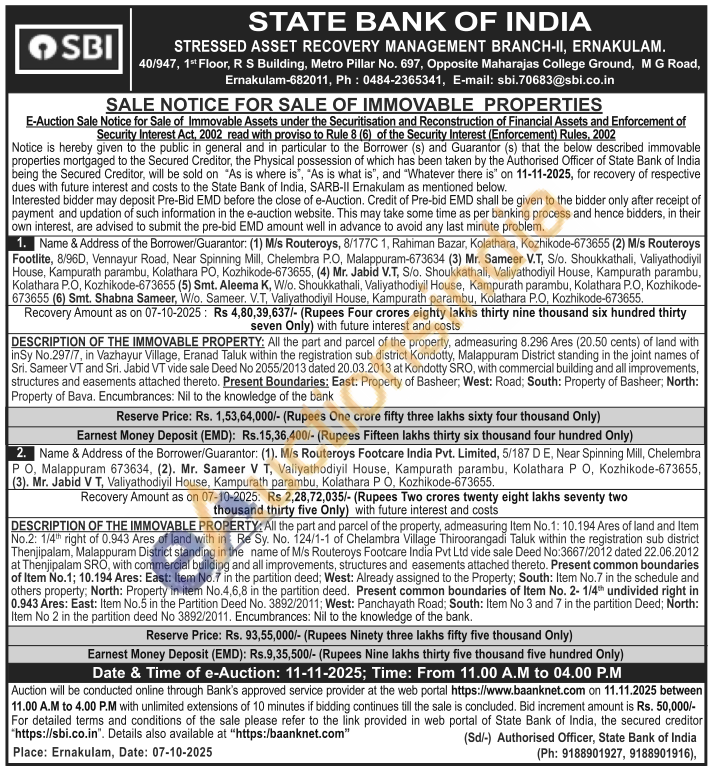 All the part and parcel of the property, admeasuring Item No.1: 10.194 Ares of land and Item No.2: 1/4th right of 0.943 Ares of land with in Re Sy. No. 124/1-1 of Chelambra Village Thiroorangadi Taluk within the registration sub district Thenjipalam, Malappuram District standing in the name of M/s Routeroys Footcare India Pvt Ltd vide sale Deed No:3667/2012 dated 22.06.2012 at Thenjipalam SRO, with commercial building and all improvements, structures and easements attached thereto. Present common boundaries of Item No.1; 10.194 Ares: East: Item No.7 in the partition deed; West: Already assigned to the Property; South: Item No.7 in the schedule and others property; North: Property in item No.4,6,8 in the partition deed. Present common boundaries of Item No. 2-1/4th undivided right in 0.943 Ares: East: Item No.5 in the Partition Deed No. 3892/2011; West: Panchayath Road; South: Item No 3 and 7 in the partition Deed; North: Item No 2 in the partition deed No 3892/2011. Encumbrances: Nil to the knowledge of the bank.