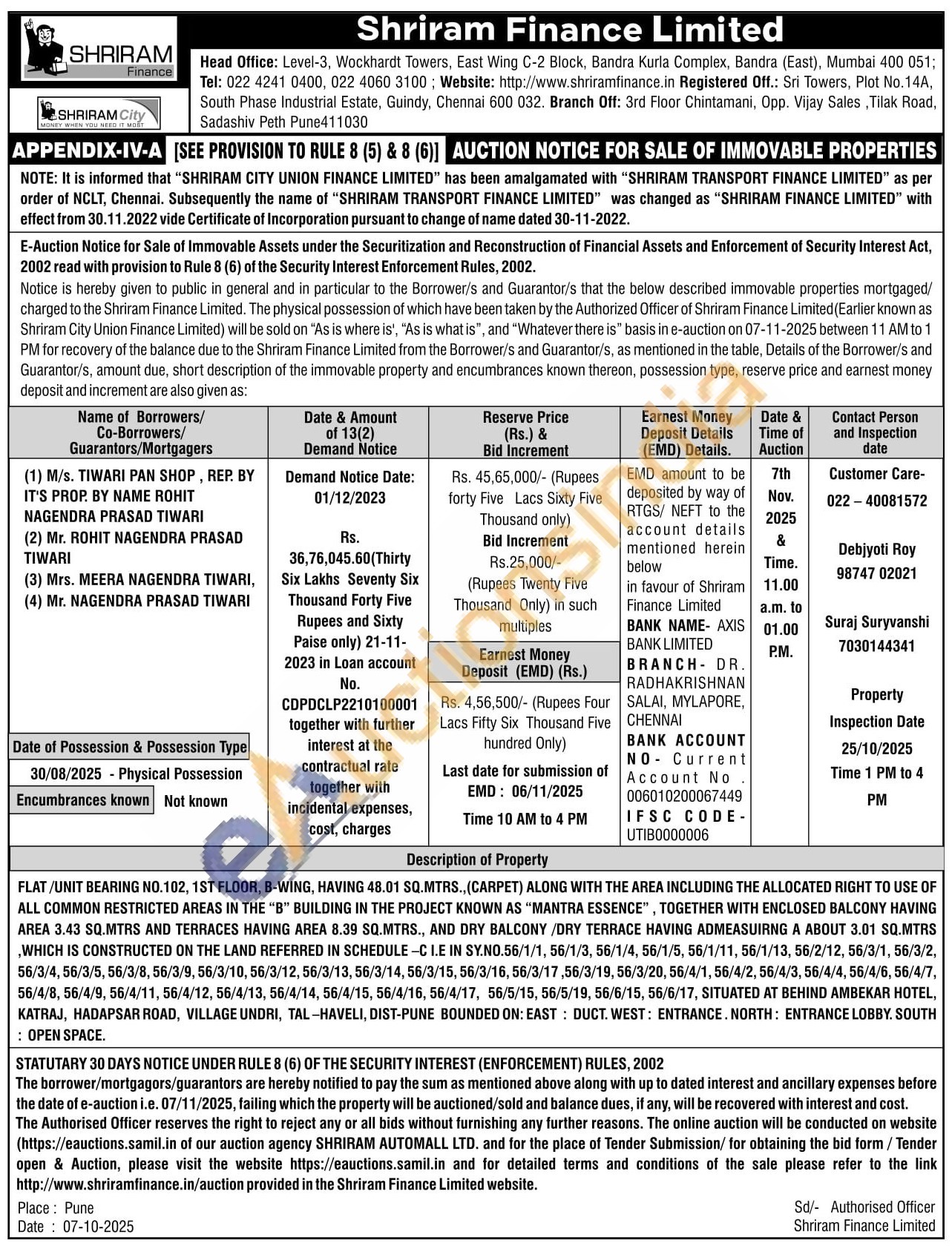 FLAT/UNIT BEARING NO.102, 1ST FLOOR, B-WING, HAVING 48.01 SQ.MTRS., (CARPET) ALONG WITH THE AREA INCLUDING THE ALLOCATED RIGHT TO USE OF ALL COMMON RESTRICTED AREAS IN THE "B" BUILDING IN THE PROJECT KNOWN AS "MANTRA ESSENCE", TOGETHER WITH ENCLOSED BALCONY HAVING AREA 3.43 SQ.MTRS AND TERRACES HAVING AREA 8.39 SQ.MTRS., AND DRY BALCONY/DRY TERRACE HAVING ADMEASUIRNG A ABOUT 3.01 SQ.MTRS WHICH IS CONSTRUCTED ON THE LAND REFERRED IN SCHEDULE-C I.E IN SY.ΝΟ.56/1/1, 56/1/3, 56/1/4, 56/1/5, 56/1/11, 56/1/13, 56/2/12, 56/3/1, 56/3/2, 56/3/4,56/3/5,56/3/8, 56/3/9,56/3/10, 56/3/12, 56/3/13, 56/3/14, 56/3/15, 56/3/16, 56/3/17,56/3/19,56/3/20, 56/4/1,56/4/2,56/4/3,56/4/4,56/4/6,56/4/7, 56/4/8, 56/4/9, 56/4/11, 56/4/12, 56/4/13, 56/4/14, 56/4/15, 56/4/16, 56/4/17, 56/5/15, 56/5/19, 56/6/15, 56/6/17, SITUATED AT BEHIND AMBEKAR HOTEL, KATRAJ, HADAPSAR ROAD, VILLAGE UNDRI, TAL-HAVELI, DIST-PUNE BOUNDED ON: EAST: DUCT. WEST: ENTRANCE. NORTH: ENTRANCE LOBBY. SOUTH : OPEN SPACE.