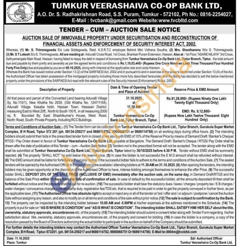 All that piece and parcel of (the Converted Land bearing Aduvalli Village Sy. No.110/1), New Khatha No 2939, (Old Khatha No. 1247/1154), Aduvalli Village, Kasaba hobli, Hassan Town, Hasssan District. measuring East to West 20ft., North to South 100 ft., in all measuring 2000 sq. ft. Bounded By: East: Shashikumar's House, West: Road, North: Road, South: Private Property, Including RCC Bulidings