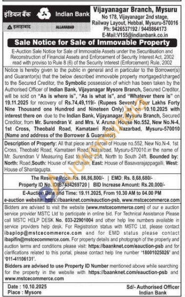 Description of Property: All that piece and parcel of House no.552. New No. N-4, 1st Cross, Theobald Road, Kamataeri Road, Nazarbad, Mysuru-570010 in the name of Mr. Surendran V Measuring East to West 25ft, North to South 24ft. Bounded by: North: Road, South: House of Kenchaiah, East: House of Basavarajappagalli, West: House of Shantagupta.