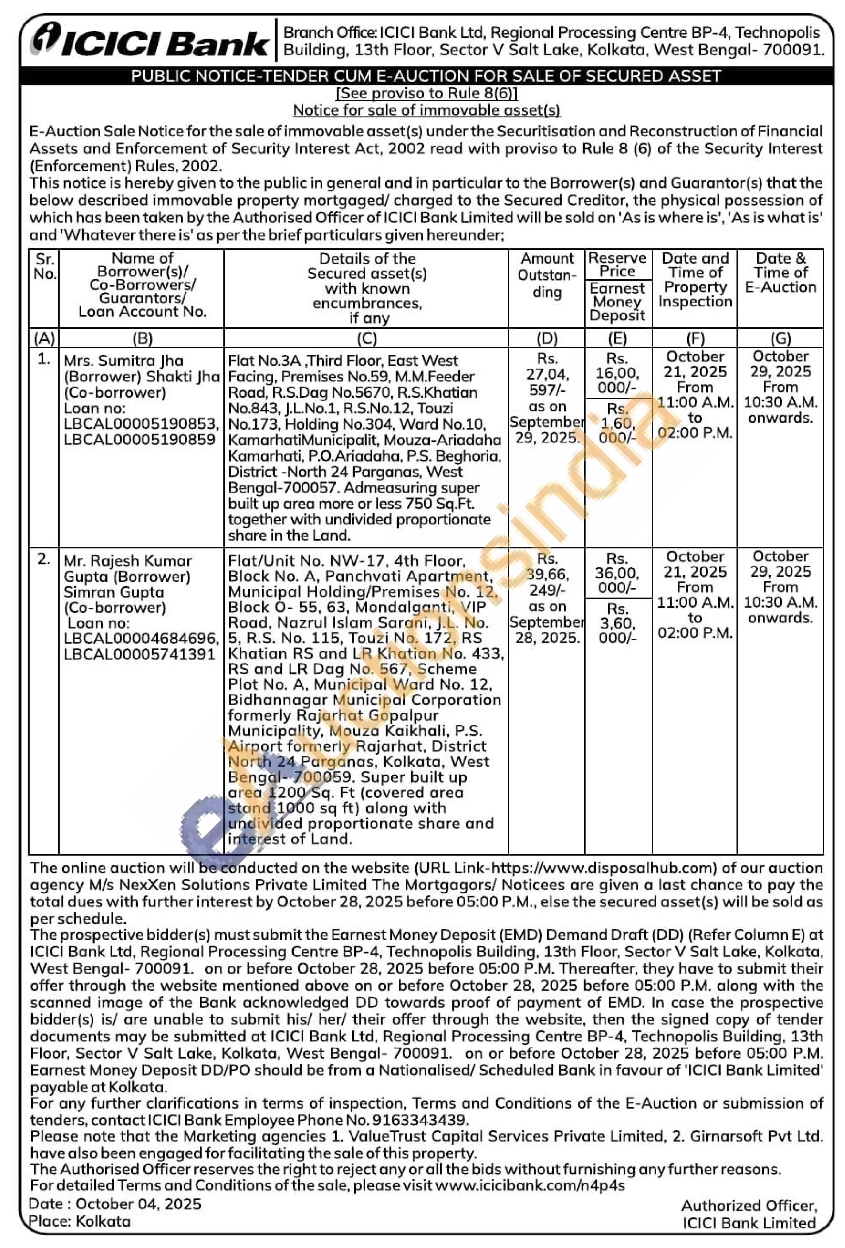 1) Flat No.3A, Third Floor, East West Road, R.S.Dag No.5670, R.S.Khatian No.843, J.L.No.1. R.S.No. 12, Touzi Facing, Premises No.59, M.M.Feeder No.173, Holding No.304, Ward No.10, Kamarhati Municipalit, Mouza-Ariadaha Kamarhati, P.O.Ariadaha, P.S. Beghoria, District-North 24 Parganas, West Bengal-700057. Admeasuring super built up area more or less 750 Sq.Ft. together with undivided proportionate share in the Land