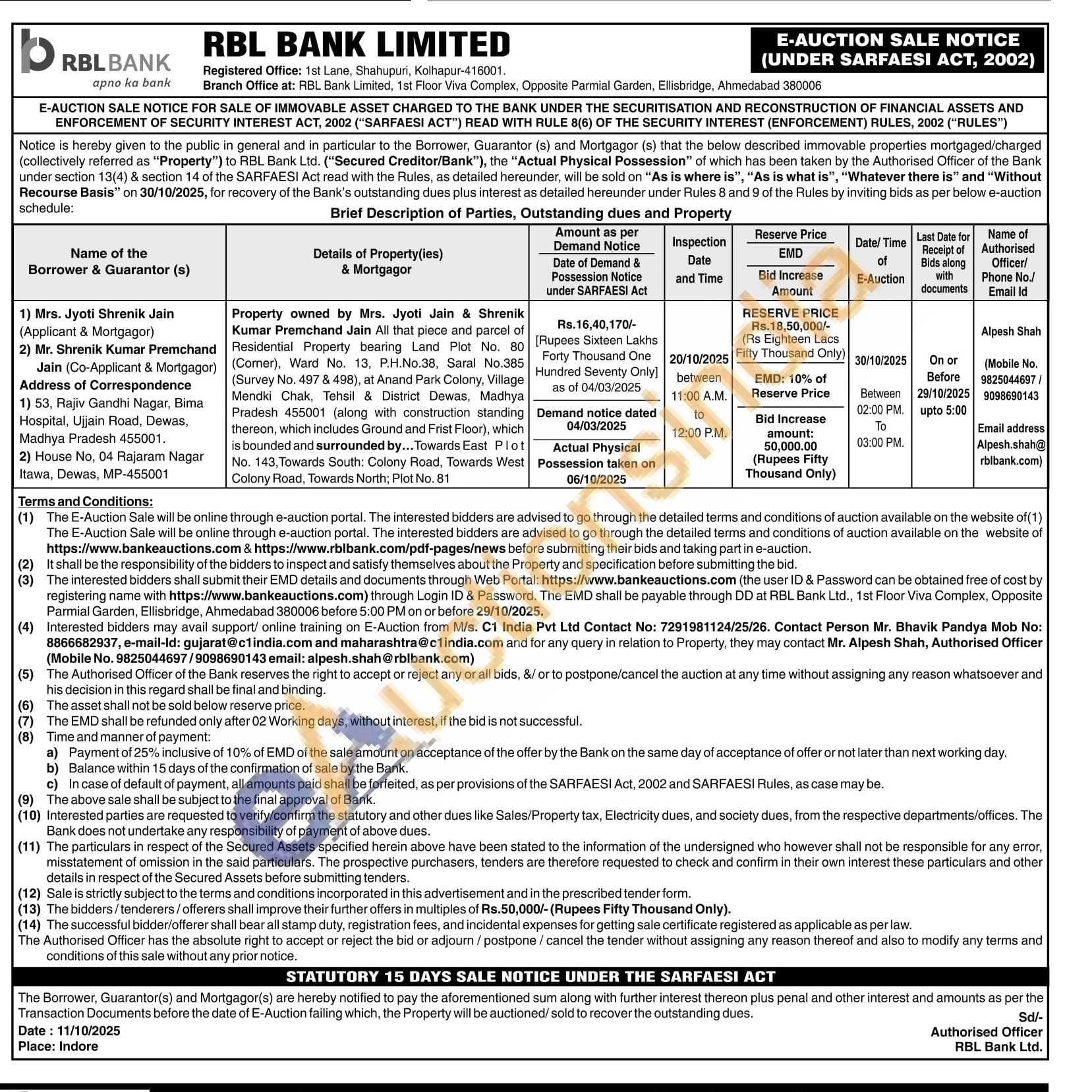 Property owned by Mrs. Jyoti Jain & Shrenik Kumar Premchand Jain All that piece and parcel of Residential Property bearing Land Plot No. 80 (Corner), Ward No. 13, P.H.No.38, Saral No.385 (Survey No. 497 & 498), at Anand Park Colony, Village Mendki Chak, Tehsil & District Dewas, Madhya Pradesh 455001 (along with construction standing thereon, which includes Ground and Frist Floor), which is bounded and surrounded by... Towards East Plot No. 143, Towards South: Colony Road, Towards West Colony Road, Towards North; Plot No. 81