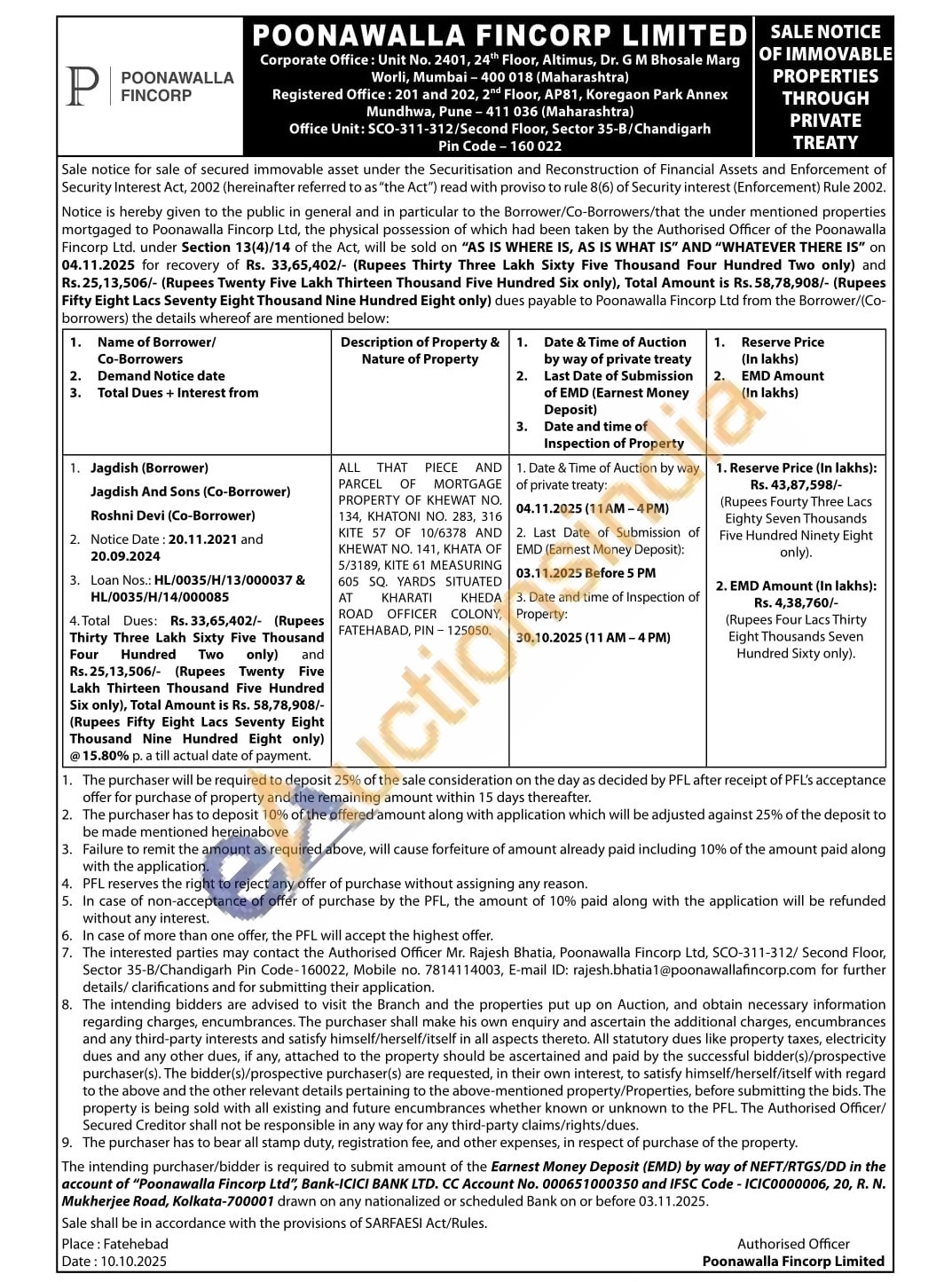 Authorised Officer Mr. Rajesh BhatiaMobile no. 7814114003