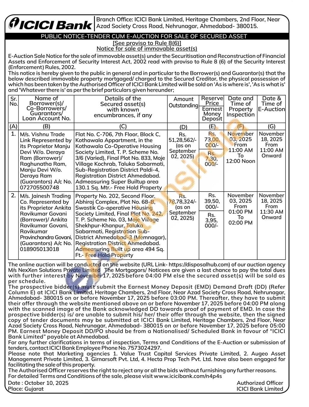 Property No. 202, Second Floor, Abhiraj Complex, Plot No. 68-B, Swastik Co-operative Housing Society Limited, Final Plot No. 242, T. P. Scheme No. 03, Moje Village Shekhpur-Khanpur, Taluka Sabarmati, Registration Sub-District Ahmedabad-3 (Memnagar), Registration District Ahmedabad. Admeasuring Built up area 494 Sq. Ft.- Free Hold Property