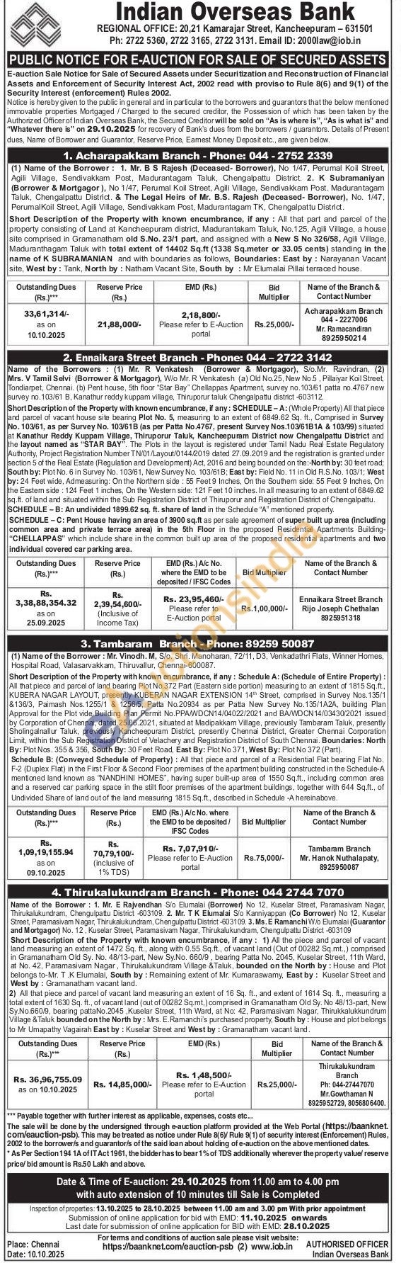 Short Description of the Property with known encumbrance, if any: Schedule A: (Schedule of Entire Property): All that piece and parcel of land bearing Plot No 372 Part (Eastern side portion) measuring to an extent of 1815 Sq.ft., KUBERA NAGAR LAYOUT, presently KUBERAN NAGAR EXTENSION 14 Street, comprised in Survey Nos. 135/1 &136/3, Paimash Nos. 1255/1 & 1256/5, Patta No.20934 as per Patta New Survey No. 135/1A2A, building Plan Approval for the Piot vide Building Plan Permit No.PPAWDCN14/04022/2021 and BA/WDCN14/03430/2021 issued by Corporation of Chennai, dated 25.06.2021, situated at Madipakkam Village, previously Tambaram Taluk, presently Sholingainallur Taluk, previously Kancheepuram District presently Chennai District, Greater Chennai Corporation Limit, within the Sub Registration District of Velachery and Registration District of South Chennai, Boundaries: North By: Plot Nos. 355 & 356, South By: 30 Feet Road. East By: Plot No 371, West By: Plot No 372 (Part). Schedule B: (Conveyed Schedule of Property): All that piece and parcel of a Residential Flat bearing Flat No. F-2 (Duplex Flat) in the First Floor & Second Floor premises of the apartment building constructed in the Schedule-A mentioned land known as "NANDHINI HOMES", having super built-up area of 1550 Sqft., including common area and a reserved car parking space in the stilt floor premises of the apartment buildings, together with 644 Soft, of Undivided Share of land out of the land measuring 1815 Sq.ft., described in Schedule Ahereinabove