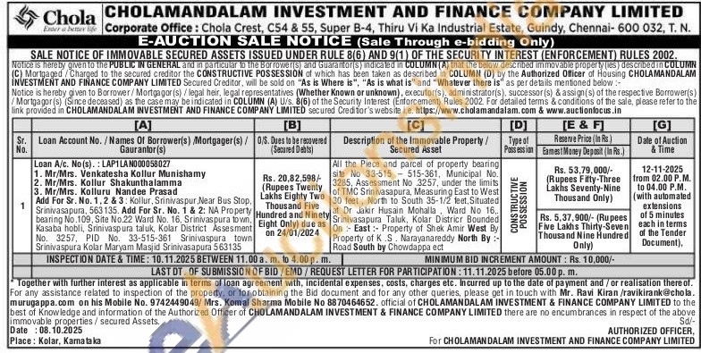 All the Piece and parcel of property bearing site No 33-515515-361, Municipal No. 3285, Assessment No 3257, under the limits of TMC Srinivasapura, Measuring East to West 30 feet, North to South 35-1/2 feet, Situated at Jakir Ward No 16. of Dreal Husain Mohalla, srinivasapura taluk, kolar dist, Bounded On East: Property of Shek Amir West By Property of K.S. Narayanareddy North By: Road South by Chowdappa ect