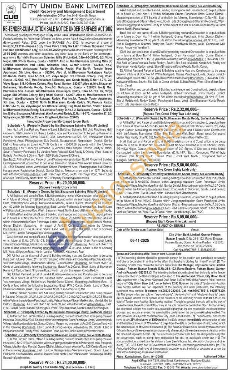 Schedule-B: (Property Owned by M/s Bhavanam Spinning Mills (P) Limited) A) All that part and parcel of land & Building existing now and Construction to be putup thers on in future at Nos: 211/28/241 and 243. Situated within Velavarthipad Gram Panchayat limits, Velavarthipadu Vilage, Medikonduru Mandal, Guntur District. Measuring an extent of Ac. 1.00 within the following Boundares East Land of Patibanda Sinivasa Rao South Land of Patbandla Koteswara Rao West: Srpuram Road, North Land of Bhavanan Konda Reddy B) All that Part and Parcel of Land & Bulding existing now and Construction to be putup there on in future at DN2112A/2A18, 21120/20, D.Nos 210:28:18 and 21028/03C2 Situated within Velavarthipadu Gram Panchayat Limits, Velavarthpadu Vifage, Medikonduru Mandal, Guntur District Measuring An extent of Ac.060 Denits of Land within the following Boundaries East PID Canal, South: Land Sold to Spinning Mil, West: Land of Spinning M North: Land of Sanagavarapu Venkateswarhu