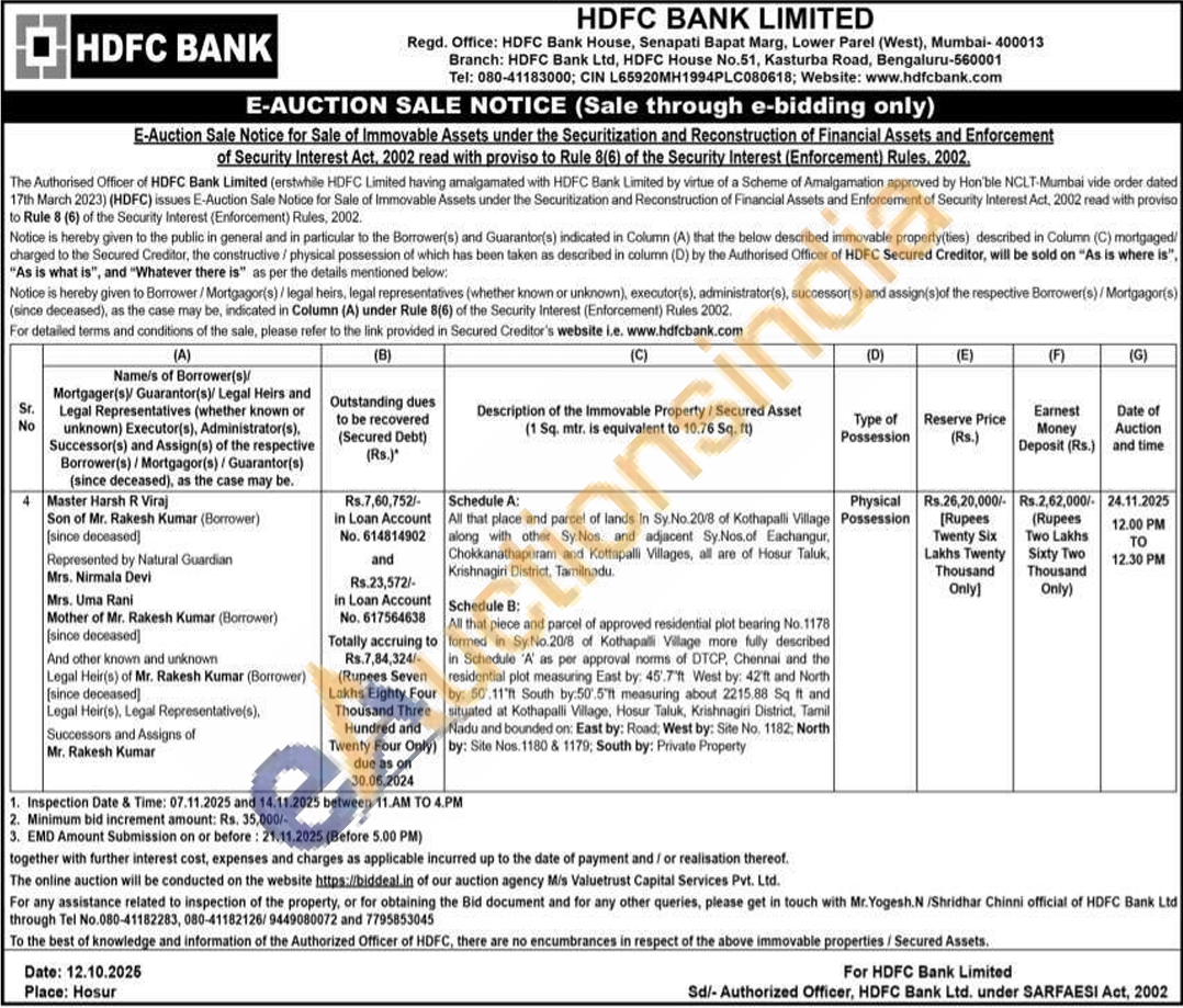 All that place and parcel of lands In Sy.No.20/8 of Kothapalli Village along with other Sy. Nos and adjacent Sy.Nos.of Eachangur, Chokkanathapuram and Kottapalli Villages, all are of Hosur Taluk, Krishnagiri District, Tamilnadu.