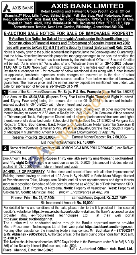 SCHEDULE OF PROPERTY: All that piece and parcel of land with all other improvements therein having an extent of 2.53 Ares in Re-Sy. No. 24/1 (24/1-3) in Oorakam Village situated at Thiroorangadi Taluk, Malappuram District and all other appurtenances/structures and rights thereto more fully described under Schedule of the Sale Deed No. 2113/2020 of Vengara Sub Registrar Office. Boundaries: East: Property of Avunjikadan Nedumparambu Sankaran & Babu; North: Property of Remanan & Mini; West: Panchayath Concrete Road; South: Property of Madappaly Muhammed Ameer & Sons. [Known Encumbrances (If Any): Nil]