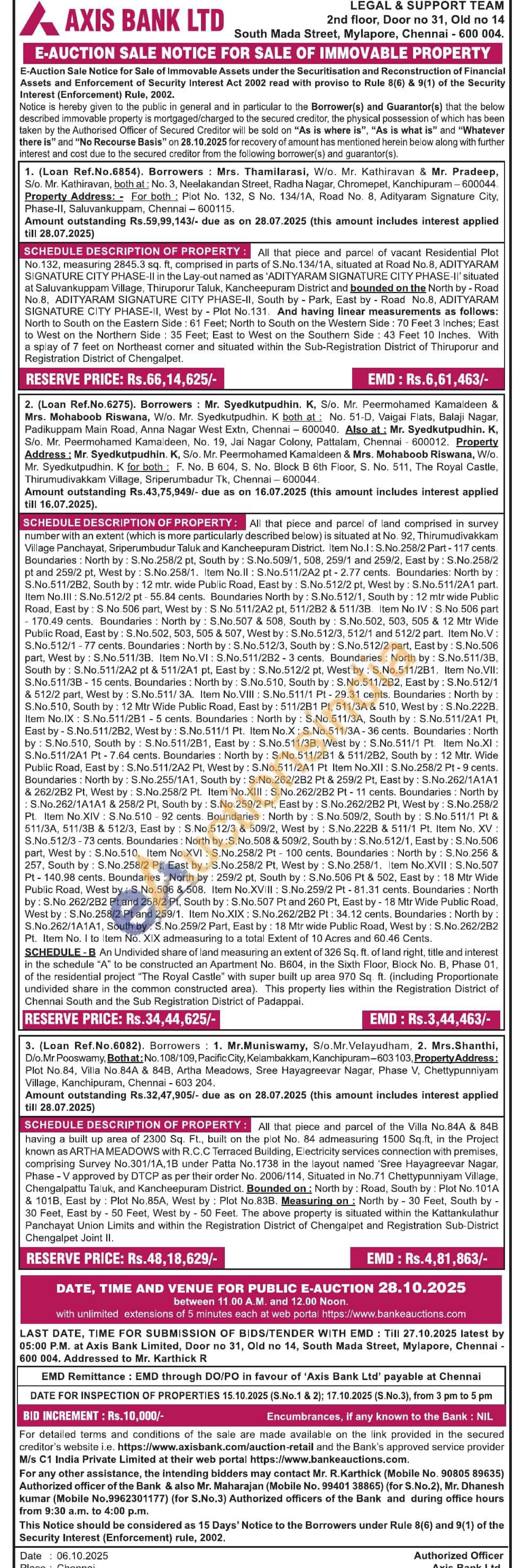All that piece and parcel of vacant Residential Plot No. 132, measuring 2845.3 sq. ft, comprised in parts of S.No. 134/1A, situated at Road No. 8, ADITYARAM SIGNATURE CITY PHASE-II in the Lay-out named as 'ADITYARAM SIGNATURE CITY PHASE-II' situated at Saluvankuppam Village, Thiruporur Taluk, Kancheepuram District and bounded on the North by-Road No. 8, ADITYARAM SIGNATURE CITY PHASE-II, South by Park, East by Road No.8, ADITYARAM SIGNATURE CITY PHASE-II, West by Plot No.131. And having linear measurements as follows: North to South on the Eastern Side: 61 Feet; North to South on the Western Side: 70 Feet 3 inches: East to West on the Northern Side: 35 Feet: East to West on the Southem Side: 43 Feet 10 Inches. With a spiay of 7 feet on Northeast corner and situated within the Sub-Registration District of Thiruporur and Registration District of Chengalpet.