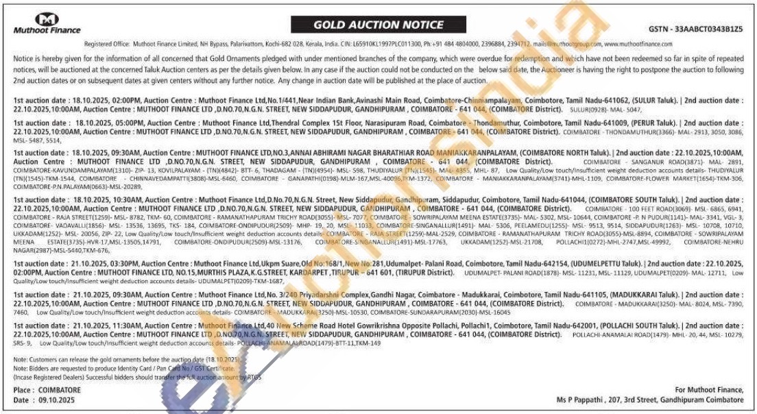 Muthoot Finance Ltd Gold Auctions Auction in Coimbatore