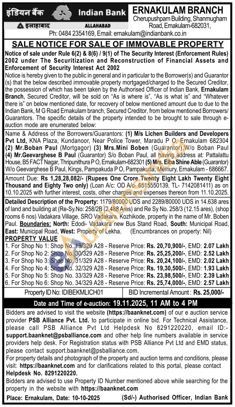 Detailed Description of the Property: 1179/80000 UDS and 2289/80000 UDS in 14.638 ares of land and building at (Re-Sy.No: 258/2B (2.488 Ares) and Re Sy No. 258/3 (12.15 ares), (shop rooms 6 nos) Vadakara Village, SRO Vadakara, Kozhikode, property in the name of Mr. Boben Paul. Boundaries: North: Edodi- Vadakara new Bus Stand Road, South: Municipal Road, East: Municipal Road, West: Property of Lekha. (Encumbrances on property: Nil)