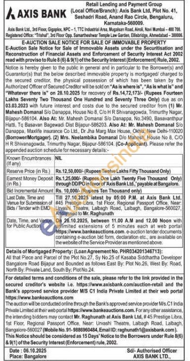 All that Piece and Parcel of the Plot No.27, Sy No.25 of Kasaba Siddhartha Developer Bangalore Road Bijapur and Bounded as follows East By: Plot No.26, West By: Road, North By: Private Land, South By: Plot No.24.
