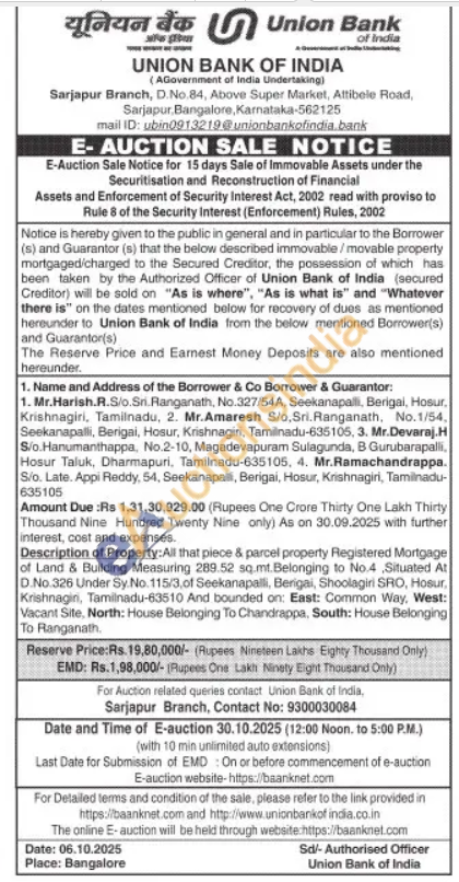 All that piece & parcel property Registered Mortgage of Land & Building Measuring 289.52 sq.mt. Belonging to No.4 Situated At D.No.326 Under Sy No. 115/3,of Seekanapalli, Berigal, Shoolagiri SRO, Hosur, Krishnagin, Tamilnadu-63510 And bounded on: East: Common Way, West: Vacant Site, North: House Belonging To Chandrappa, South: House Belonging To Ranganath