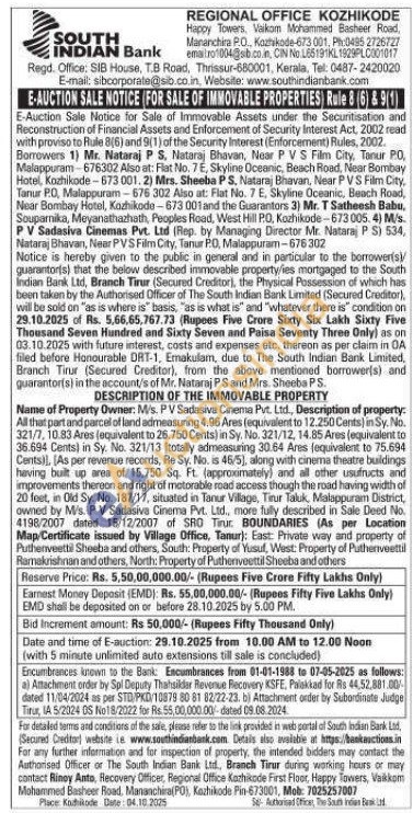 Name of Property Owner: M/s. PV Sadasiva Cinema Pvt. Ltd., Description of property: All that part and parcel of land admeasuring 4.96 Ares (equivalent to 12.250 Cents) in Sy. No. 321/7, 10.83 Ares (equivalent to 26.750 Cents) in Sy. No. 321/12, 14.85 Ares (equivalent to 36.694 Cents) in Sy. No. 321/13 (totally admeasuring 30.64 Ares (equivalent to 75.694 Cents)], [As per revenue records, Re Sy. No. is 46/5), along with cinema theatre buildings having buit up area of 15,750 Sq. Ft. (approximately) and all other usufructs and improvements thereon and right of motorable road access though the road having width of 20 feet, in Old Sy. No. 187/17, situated in Tanur Village, Tirur Taluk, Malappuram District, owned by Ms. PV Sadasiva Cinema Pvt. Ltd., more fully described in Sale Deed No. 4198/2007 dated 15/12/2007 of SRO Tirur BOUNDARIES (As per Location Map/Certificate issued by Village Office, Tamur): East: Private way and property of Puthenveettil Sheeba and others, South: Property of Yusuf, West: Property of Puthenveettil Ramakrishnan and others, North: Property of Puthenveettil Sheeba and others