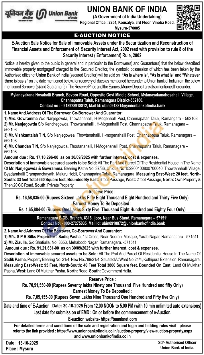 Description of immovable secured assets to be Sold: All The Part And Parcel Of The Residential House In The Name Of Mr. Nanjegowda & Gowramma. Bearing Katha No. 37/36, Unique No 152900100800700040, Thowtanahalli Village, Byadarahalli Grampanchayath, Maluru Hobli, Channapatna Taluk, Ramanagara. Measuring East-West: 20 feet, North-South: 33 feet Total 660 Square feet, Bounded By East: 6 feet Passage, West: 2 feet Passage, North: Own Property &