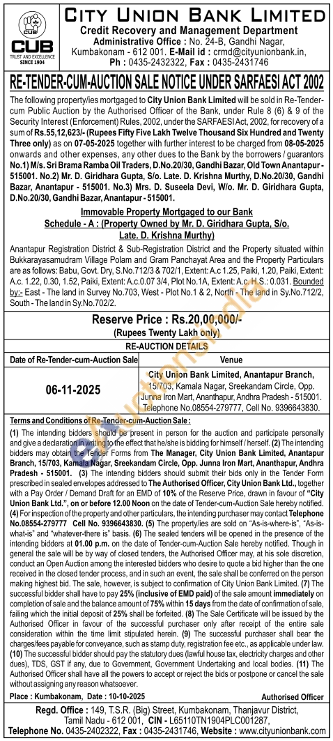 Anantapur Registration District & Sub-Registration District and the Property situated within Bukkarayasamudram Village Polam and Gram Panchayat Area and the Property Particulars are as follows: Babu, Govt. Dry, S.No. 712/3 & 702/1, Extent: A.c 1.25, Paiki, 1.20, Paiki, Extent: A.c. 1.22, 0.30, 1.52, Paiki, Extent: A.c.0.07 3/4, Plot No. 1A, Extent: A.c. H.S.: 0.031. Bounded by:- East -The land in Survey No.703, West - Plot No.1 & 2, North - The land in Sy. No.712/2, South-The land in Sy. No.702/2.