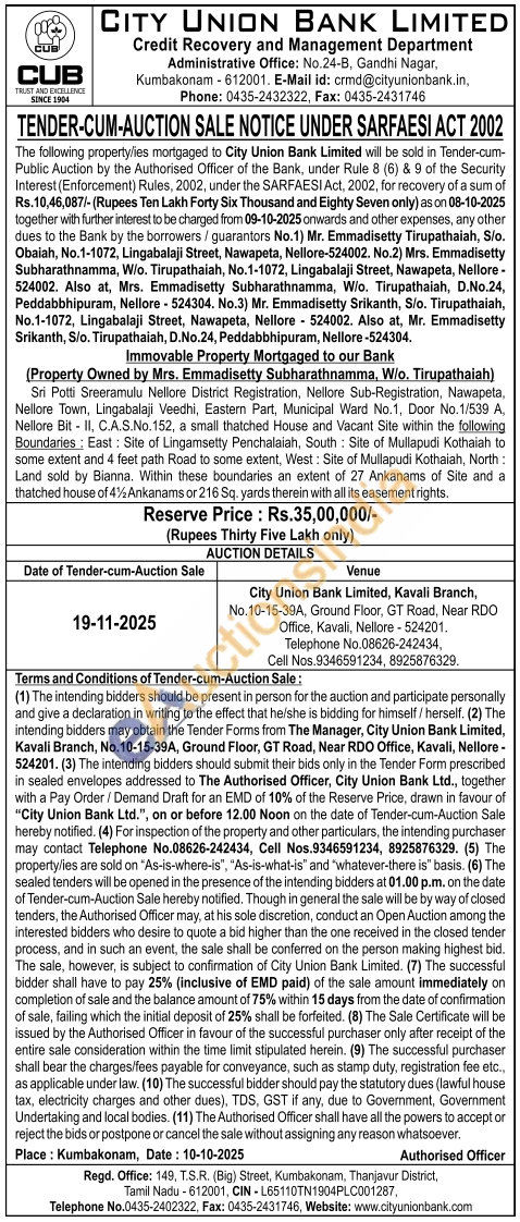 Sri Potti Sreeramulu Nellore District Registration, Nellore Sub-Registration, Nawapeta, Nellore Town, Lingabalaji Veedhi, Eastern Part, Municipal Ward No.1, Door No.1/539 A, Nellore Bit II, C.A.S.No.152, a small thatched House and Vacant Site within the following Boundaries: East: Site of Lingamsetty Penchalaiah, South Site of Mullapudi Kothaiah to some extent and 4 feet path Road to some extent, West: Site of Mullapudi Kothaiah, North: Land sold by Bianna. Within these boundaries an extent of 27 Ankanams of Site and a thatched house of 4% Ankanams or 216 Sq. yards therein with all its easement rights.