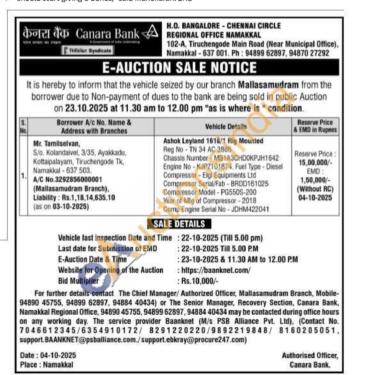Ashok Leyland 1618/1 Rig Mounted Reg No-TN 34 AC 3886 Chassis Number MB1A3CHD0KPJH1642 Engine No-KJPZ101874. Fuel Type - Diesel Compressor-Elgi Equipments Ltd Compressor Serial/Fab - BRDD161025 Compressor Model - PG550S-200 Year of Mfg of Compressor-2018 Comp Engine Serial No-JDHM422041