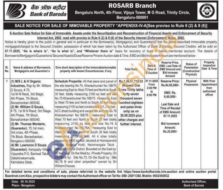 All that piece and parcel of the site bearing No.74, Khaneshumari No. 188/74 measuring East to West 70 feet and North to South 30 feet, totally measuring 2100 sq feet and site No.75 Khaneshumari No.188/75 measuring East to West 70 feet and North to South 30 feet totally measuring 2100 sq feet constructed 331.2 sq feet, ACC sheet building and vacant site and site No.76 Khaneshumari No.188/76 measuring East to West 70 feet and North to South 30 feet totally measuring 2100 sq feet and site No.76 A Khaneshumari No.188/76A measuring East to West 70 feet and North to South 30 feet totally measuring 2100 sq feet. All 4 sites totally measuring 8400 sq feet, situated at Honnasandra village, Kasaba Hobli, Nelamangala Taluk Bengaluru Rural District. Bounded on the East by: 30 feet road, On the West by: Private Property, On the North by: Site No.73. On the South by: Site No.76 B and other properties" owned by Sri William D'souza.