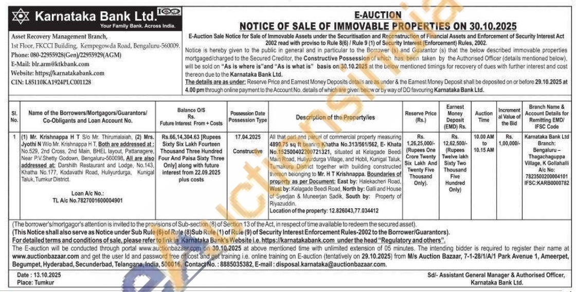 All that part and parcel of commercial property measuring 4890.75 sq ft bearing Khatha No.313/561/562, E- Khata No. 152500402200721321, situated at Kelagade Beedi Main Road, Hullyurdurga Village, and Hobli, Kunigal Taluk, Tumakuru District together with building constructed thereon belonging to Mr. HT Krishnappa. Boundaries of property as per Document: East by: Halekachen Road, West by: Kelagade Beedi Road, North by: Galli and House of Syedjan & Muneerjan Sadik, South by: Property of Riyazuddin