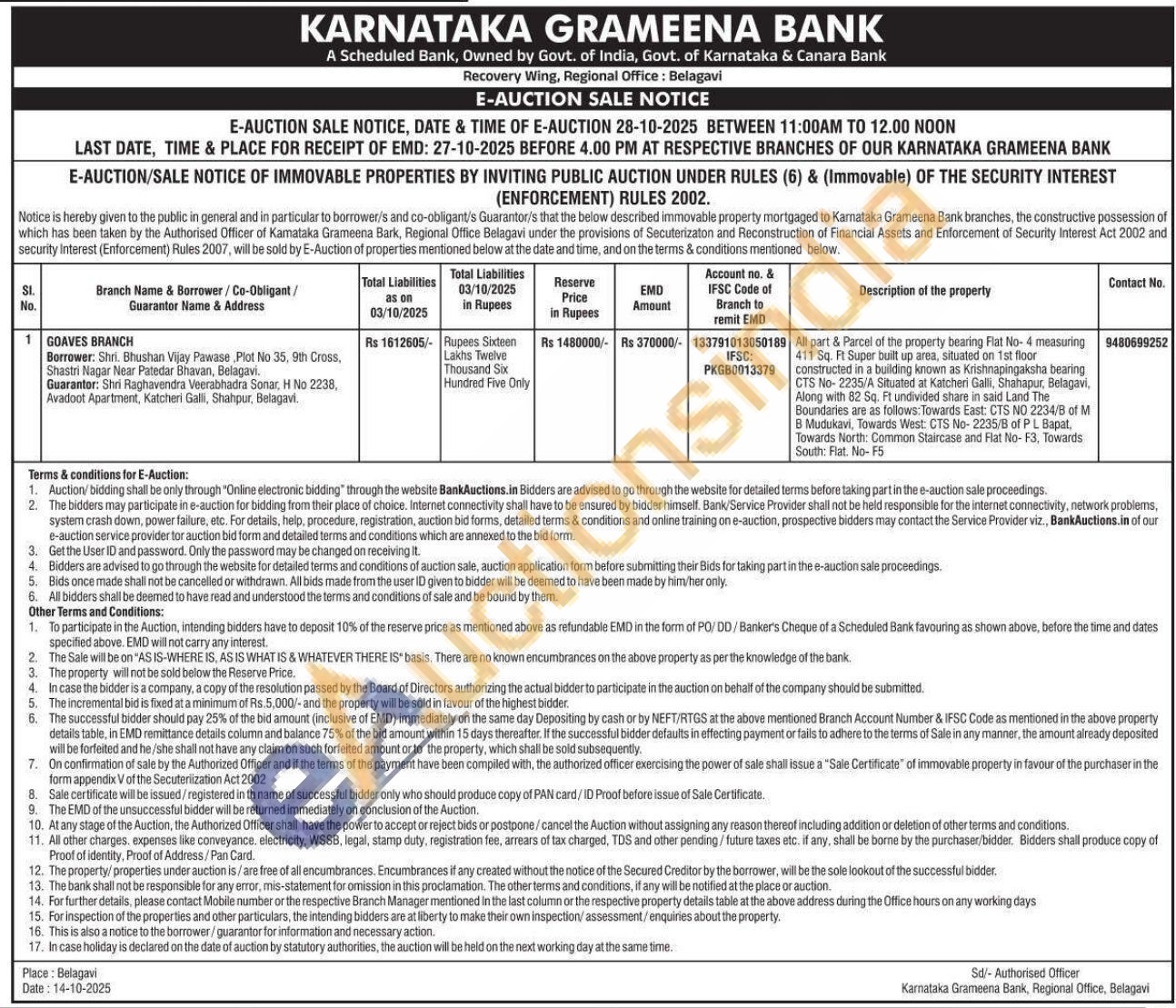 property bearing Flat No-4 measuring 411 Sq. Ft Super built up area, situated on 1st floor constructed in a building known as Krishnapingaksha bearing CTS No-2235/A Situated at Katcheri Galli, Shahapur, Belagavi. Along with 82 Sq. Ft undivided share in said Land The Boundaries are as follows: Towards East: CTS NO 2234/B of M B Mudukavi, Towards West: CTS No-2235/B of P L Bapat. Towards North: Common Staircase and Flat No-F3, Towards South: Flat. No-F5