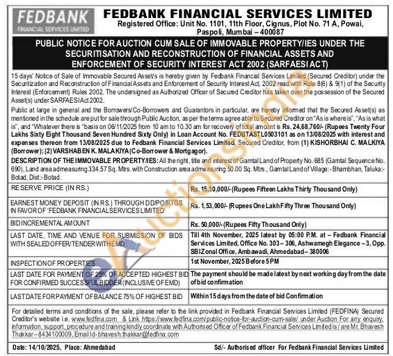 All the right, title and interest of Gamtal Land of Property No. 685 (Gamtal Sequence No. 690), Land area admeasuring 334.57 Sq. Mirs. with Construction area admeasuring 50.00 Sq. Mitrs., Gamtal Land of Village:-Bhambhan, Taluka:-Botad, Dist-Botad.