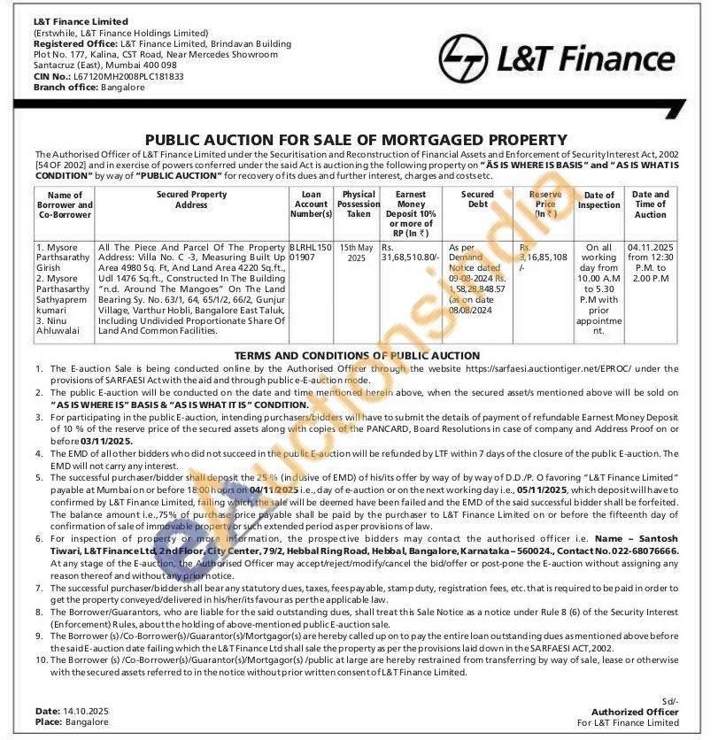 All The Piece And Parcel Of The Property Address: Villa No. C-3, Measuring Built Up Area 4980 Sq. Ft, And Land Area 4220 Sq.ft., Udl 1476 Sq.ft., Constructed In The Building "n.d. Around The Mangoes" On The Land Bearing Sy. No. 63/1, 64, 65/1/2, 66/2, Gunjur Village, Varthur Hobli, Bangalore East Taluk, Including Undivided Proportionate Share Of Land And Common Facilities.