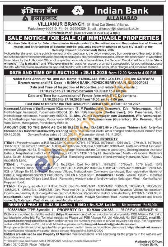 ITEM-1: Property situated at R.S No.242/4, Cad No-1079/1, 1079/2/2, 1079 bis/1, 1079 bis/2, 1079 bis/3, 1079bis/4, 1081/1/2/1,1081/2/2/2,1080/1/4/1,1080/1/4/2,1080/2/4,1080/3/4, 1080/4/4/2,1080/4/4/1, Patta No-928 at Embalam revenue Village. No-63, Embalam Revenue Village, Nettapakkam Commune panchayat, Sub registration district of Bahour, Registration district of Puducherry. EXTENT- 1426 1/2 Sq Ft. Boundaries: North Vasudeva Mudaliars Land. South-Nataraja Mudaliars House. East-Remaining western side of land owned by Natarajan. West-Appavu mudaliar's Land. ITEM-2: Property situated at RS No.242/4, Cad No-1079/1 1079/2/2, 1079bis/1, 1079 bis/2, 1079 bis/3,1079bis/4,1081/1/2/1,1081/2/2/2,1080/1/4/1,1080/1/4/2,1080/2/4,1080/3/4,1080/4/4/2,1080/4/4/1, Patta No-928 at Village No-63, Embalam Revenue Village, Nettapakkam Commune panchayat, Sub registration district of Bahour, Registration district of Puducherry. EXTENT-5598 Sq. Ft. Boundaries: North-Vaikkal. South Nataraja Mudaliars land and Girija's Land. East-Remaining western side of land owned by Natarajan. West-Kambalikaran Kuppam Road.