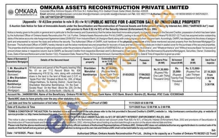 All that piece and parcel of the Property bearing Vila No. 61 as per 7/12 Record Block No. 836 admeasuring 418.32 Sq. mtrs, along with undivided share in the land in the land of Road and COP in Apple Pool Villa Situated at Block No. 206, of Moje Village Haldhanu, Ta. Kamrej, Distict-Surat Own by Shandabee Manubhai Bambhaniya. On the East Society Road On the West-Block No. 2105, On the South Villa No. 45. On the North-Ville No: 43